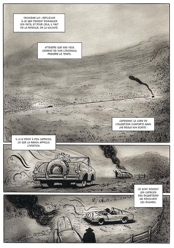 Si le graphisme semi-réaliste de PF Radice peut, de prime abord, dérouter, notamment par ses visages marqués et déformés, il faut bien reconnaître qu’il finit par nous séduire et nous plonger corps et âme dans cette histoire pour le moins inquiétante. Le crayonné, volontairement rugueux, confère aux personnages une épaisseur dramatique, tandis que les décors, les dégradés de gris et le découpage installent une atmosphère pesante, en parfaite adéquation avec la noirceur du récit. Un très beau livre !