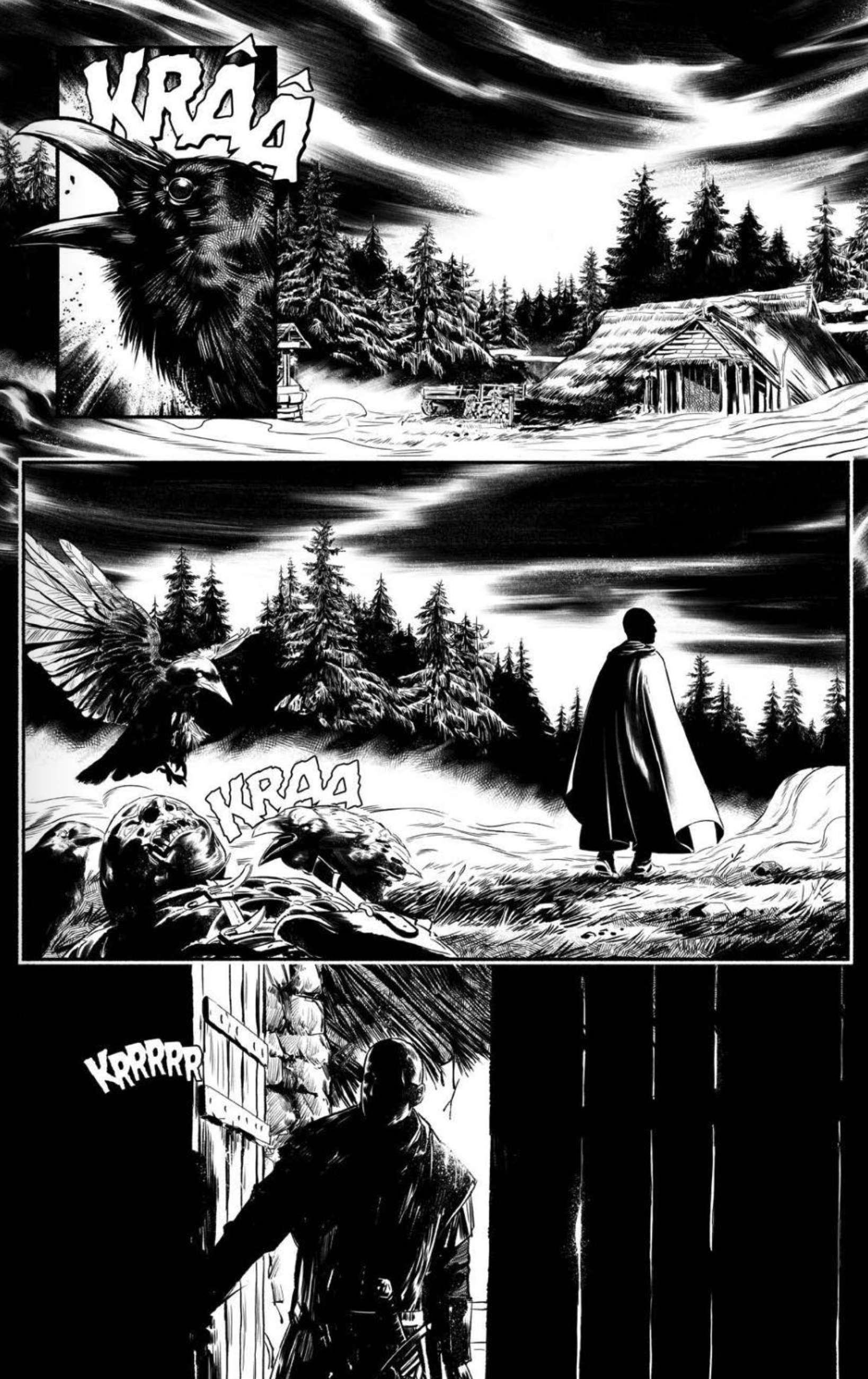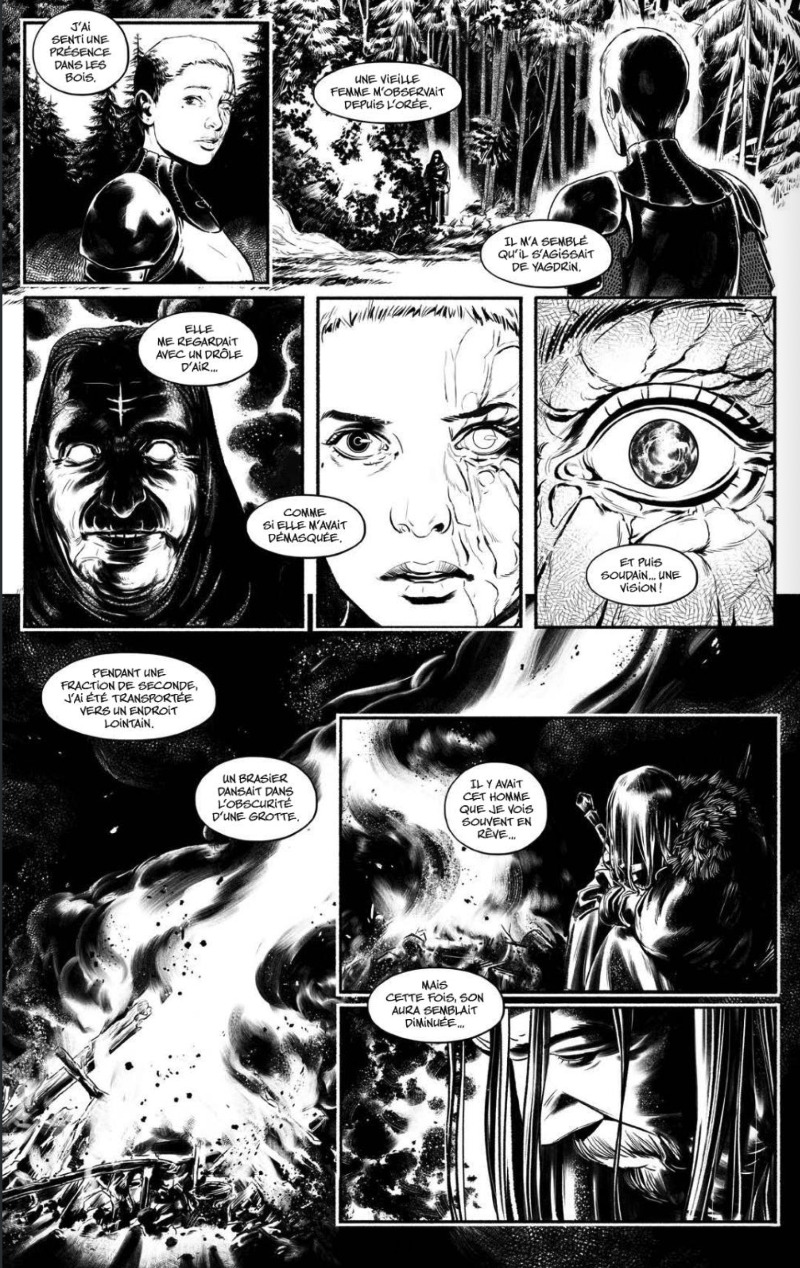 Jeune auteur complet (scénario et dessin), Ismaël Legrand connaît visiblement ses classiques de la dark fantasy. Fantasy avec ce récit épique évoluant dans un monde moyenâgeux phantasmagorique où la magie est maître et où des créatures sinistres rôdent, mais dark (‘sombre’) car dénué de toute belle princesse à sauver ou de gentils hobbits. Dans ce Deathbringer qui porte bien son nom (‘celui qui apporte la mort’), tout n’est que souffrance et désolation.