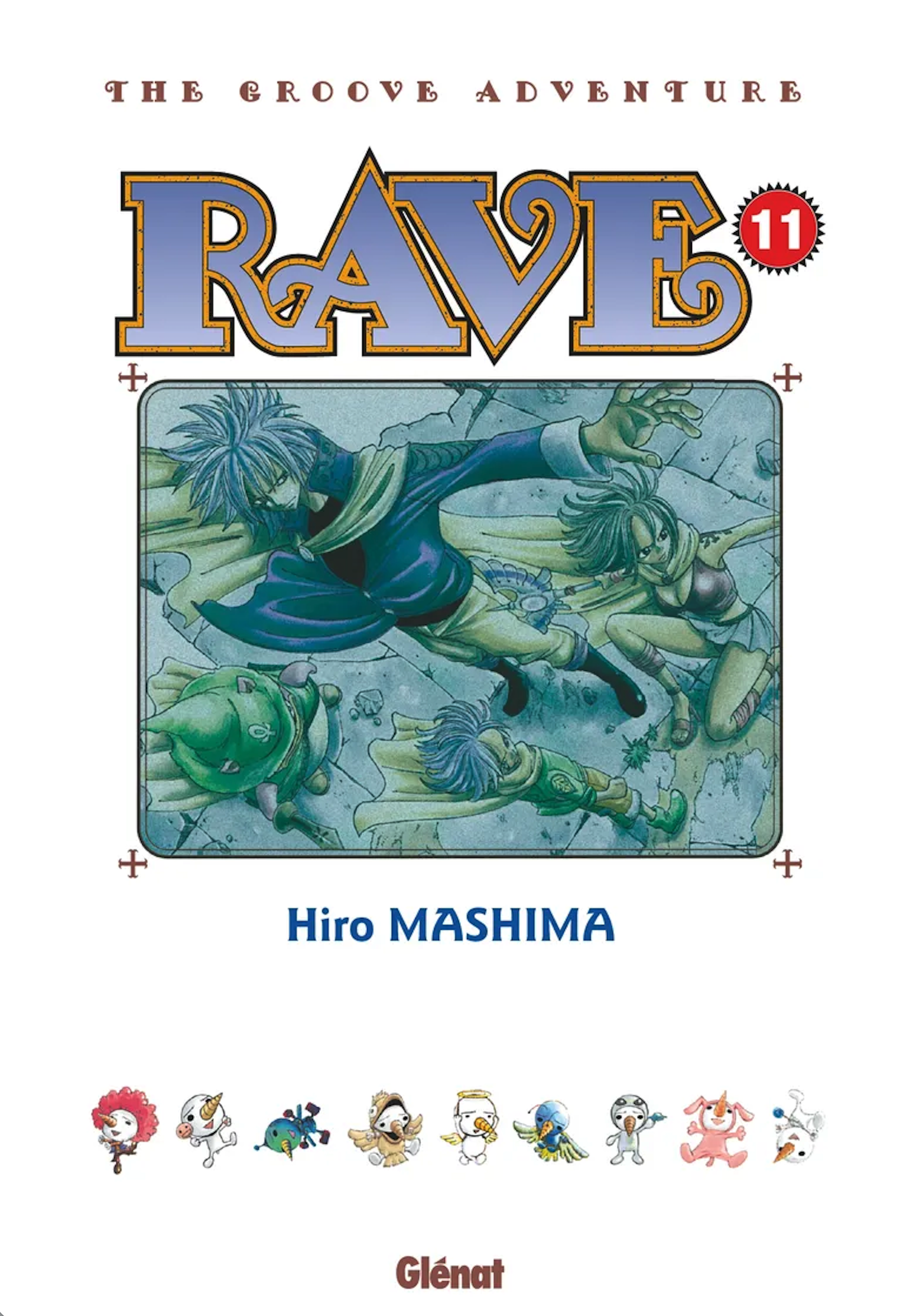 accents très Dragon Ball. L’histoire débute dans un monde au bord des ténèbres, cinquante ans après une guerre ayant opposé les Rave, pierres sacrées, aux Dark Bring, pierres maléfiques, et qui s’est soldée par la victoire des premières. Mais pour empêcher le retour des Dark Bring, un sauveur est nécessaire. Ce sera Haru, jeune garçon aux cheveux argentés, débrouillard et courageux, maniant une épée gigantesque et toujours accompagné de Plue, une étrange petite créature ressemblant à s’y méprendre à un bonhomme de neige. Ensemble, ils affrontent les Dark Bring et l’organisation criminelle Demon Card, dans un récit d’aventure généreux et dynamique. Rave marque la première grande série de l’auteur de Fairy Tail. (Rave, tome 11, de Hiro Mashima. Glénat. 14,95€ le volume)