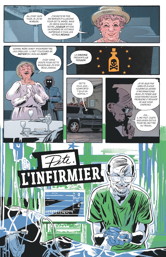 Pas tout à fait. Disons que c’est beaucoup plus sous contrôle car nous voulions être sûrs de conserver un récit cohérent. Déjà, Michael Walsh et moi nous avons écrit le premier chapitre, dessiné les contours du monde et caractérisé tous les personnages qui y évoluent. Le design des différents tueurs en série par exemple était également bien établi. Mais une fois toutes ces données établies, nous les avons mises à disposition de la salle d’écriture et demandé aux différents auteurs que nous avions conviés où est-ce qu’ils pensaient nous emmener avec tout ça.