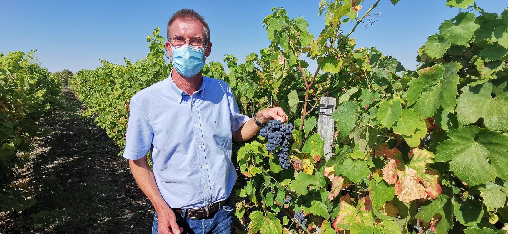 Les deux symboles de ce millésime 2020, une belle grappe de sauvignon, tenue par Eric Perrin, dans le contexte de crise sanitaire © JPS