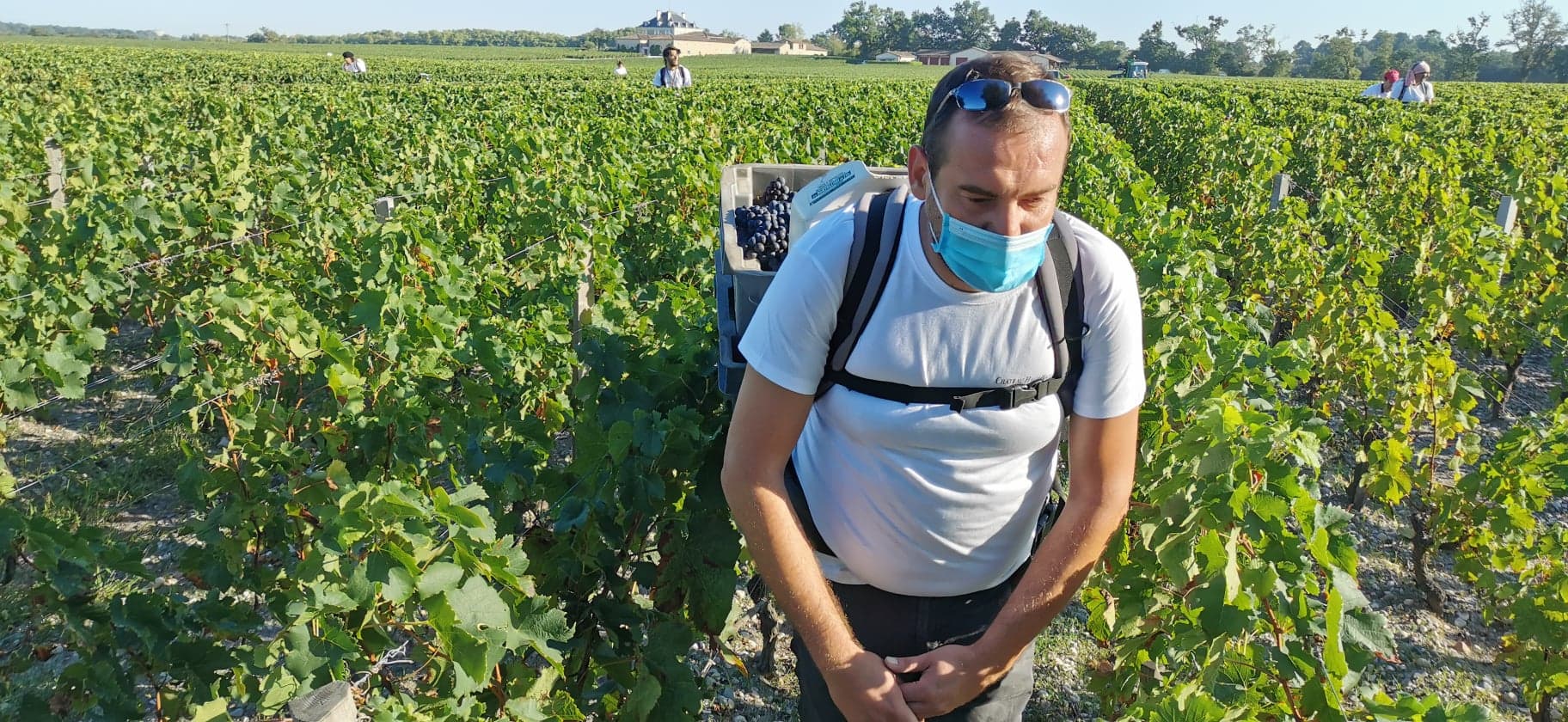 Le coup d’envoi des vendanges en blancs a été donné le 17 août en Pessac-Léognan et le 18 à Léognan… Mon premier reportage a été réalisé à la fraîche dès 7 heures au château Carbonnieux qui a lancé sa troupe de vendangeurs à l’heure du laitier où le ciel se pare de rouge-orangé. Le tournage a lieu le 24 août (eh oui, jour de mon retour de vacances) avec les frères Perrin, Eric et Philibert, très heureux de démarrer cette belle semaine de vendanges de sauvignon. Des vendanges qui cette année ont une saveur particulière, marquées par la crise sanitaire et les mesures qu’il a bien fallu prendre pour la sécurité de tous. Ainsi des masques ont été distribués aux vendangeurs et des casques avec visière protectrice pour les porteurs, un camion plate-forme a été aménagé avec une énorme citerne d’eau et des distributeurs de savon et de gel hydro-alcoolique pour permettre au bout des rangs de se laver régulièrement les mains. Les distances sont aussi respectées dans les rangs de vigne avec des coupeurs qui ne se font pas face.
