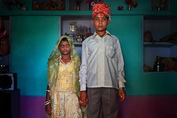 Maya (8 ans) et Kishore (11 ans) posent pour leur photo de mariage dans leur nouvel intérieur. (Crédit photo : Stephanie Sinclair / VII pour National Geographic Magazine)